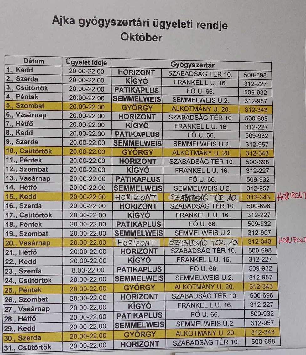 A György Gyógyszertár kiesésével október 13-tól, a következő négy ajkai gyógyszertár vállalja az ügyeleti szolgálatot felváltva a megadott időszakban: