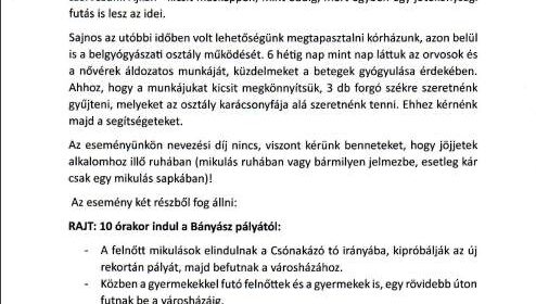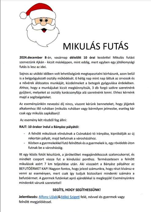 Ajkán idén december 8-án, vasárnap délelőtt 10 órakor jótékonysági Mikulásfutást rendeznek. A megszokottól eltérően, az idei futás célja az ajkai kórház belgyógyászati osztályán dolgozók megajándékozása 3db forgó székkel. A szervezők a közelmúltban személyesen tapasztalták meg az osztályon dolgozók áldozatos munkáját és a beteg gyermekek küzdelmét, ami arra ösztönözte őket, hogy a futást jótékony céllal szervezzék meg.
