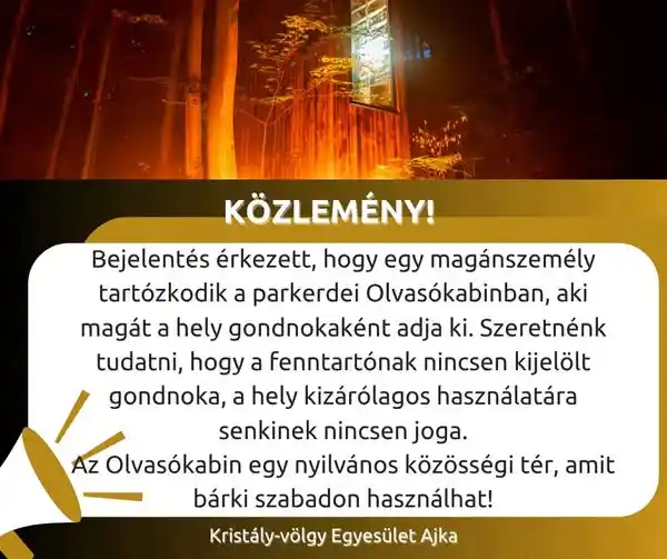 Bejelentés érkezett a Kristály-völgy Egyesülethez arról, hogy egy magánszemély rendszeresen tartózkodik az ajkai parkerdőben található Olvasókabinban, és azt a látszatot…